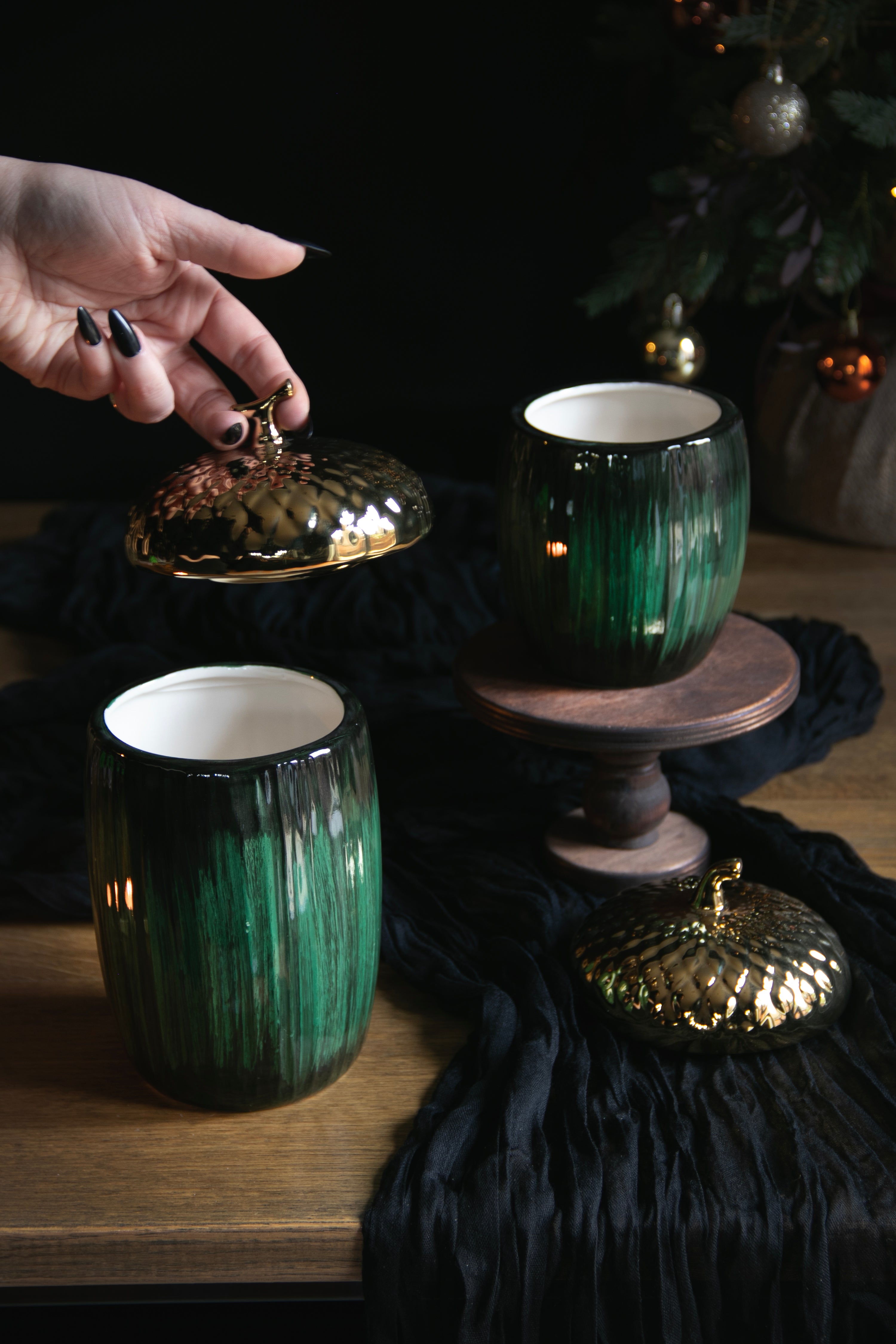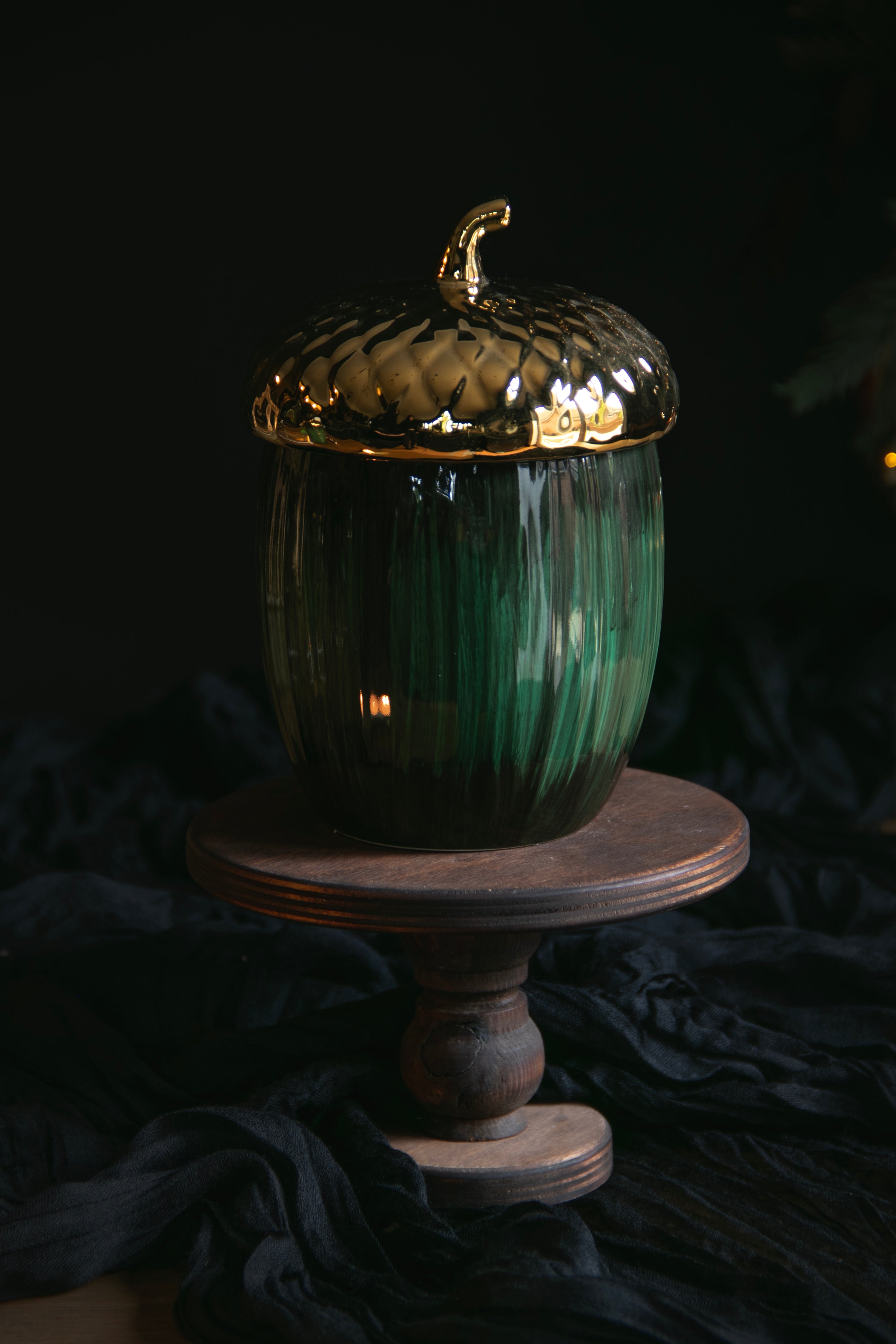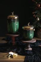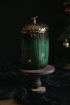 Stash your festive treats in style with this festive acorn jar. Its charming acorn silhouette commands attention on any shelf, while the gleaming gold lid adds a touch of luxury.