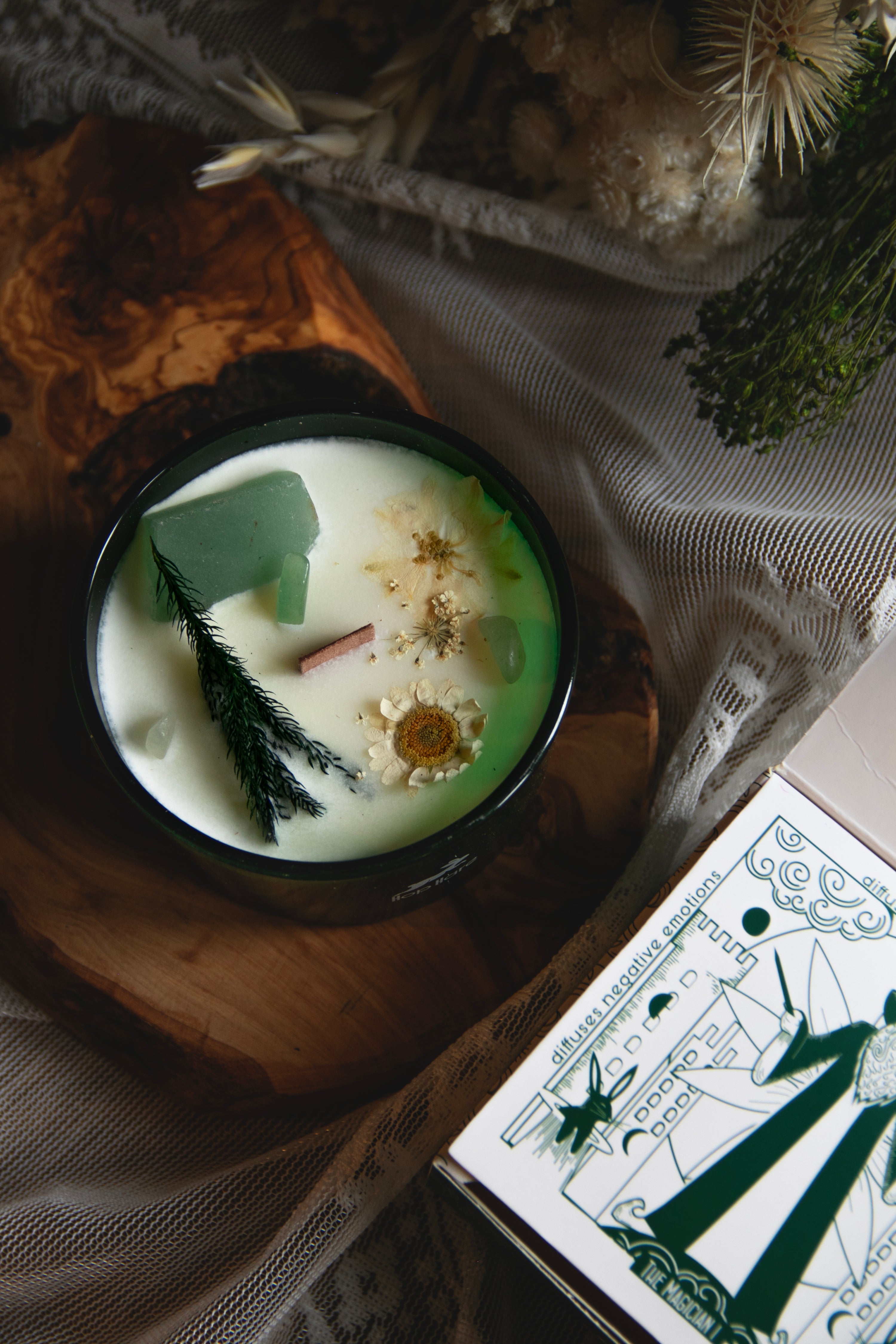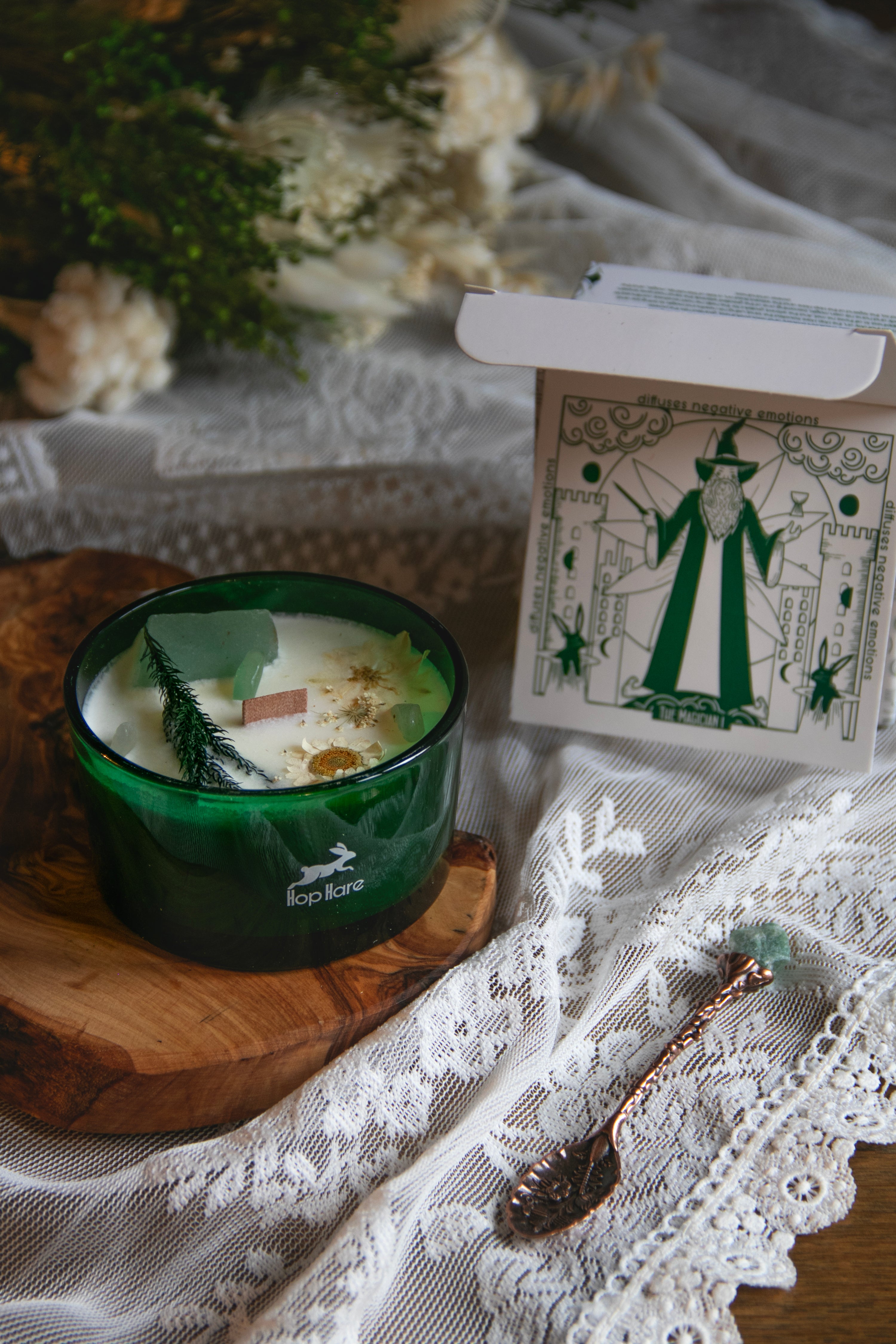 The Magician, crafted with Jade gemstone and delicate dry flowers.