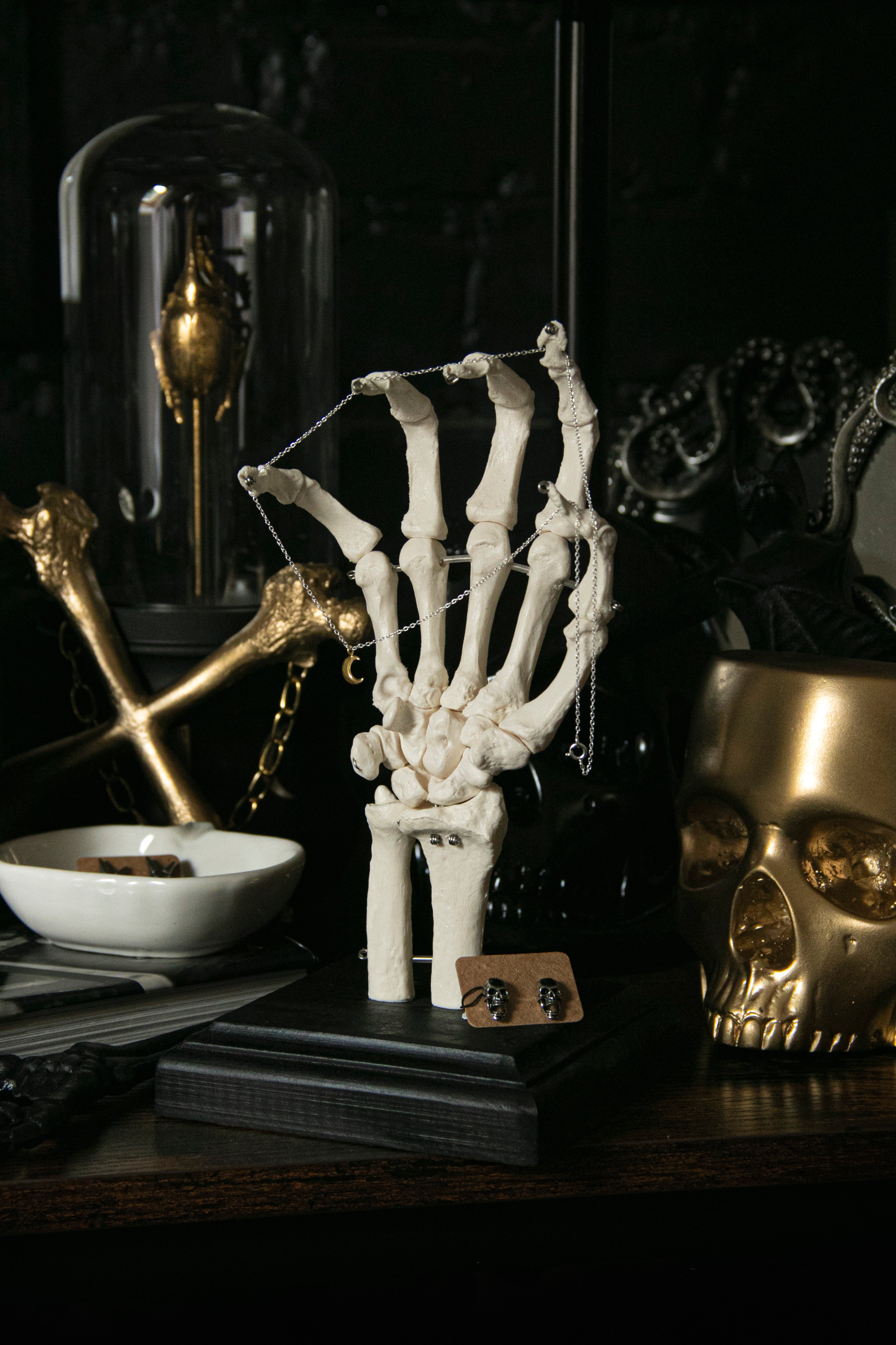 They've made a realistic, life sized skeleton hand presented on a handmade wooden base.
